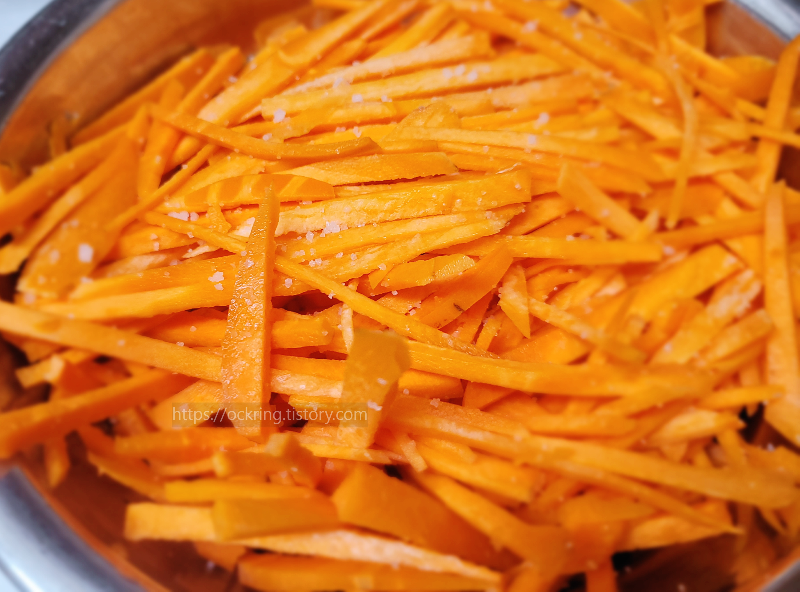 당근을 채 썰어야 하는데 나는 당근의 아삭함을 더 크게 느끼고 싶어서 굵게 썰었는데 먹어본 결과는...얇게 썰어 먹는게 더 맛있습니다..꼭 얇게 썰어서 드세요. 다음은 소금 1스푼~1스푼반정도 넣어 20~30분간 당근을 절여주세요. 좀 더 감칠맛 있게 만들고 싶다면 맛소금을 살짝 섞어도 좋답니다. 채수가 나오면서 당근의 밀도있는 아삭함을 느낄 수 있을거에요.