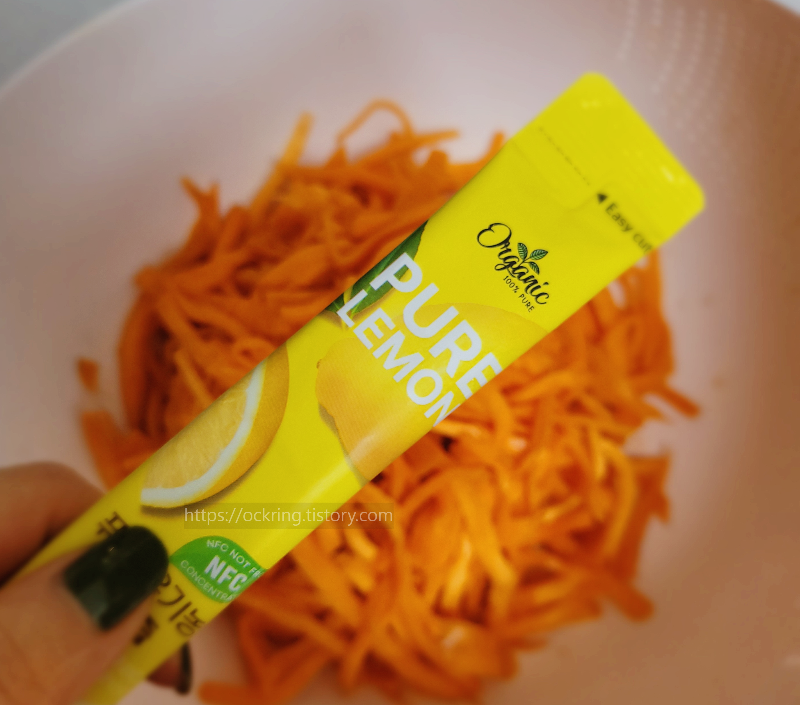 레몬의 상큼함을 좋아해서 레시피가 맘에 들기 시작했습니다. 레몬즙이 없다면 식초를 넣어도 되는데 상큼함은 좀 덜하기 때문에 레몬즙 추천드려요. 레몬즙이 당근 사이사이 잘 스며들 수 있도록 한 번 뒤적거려 줍니다.