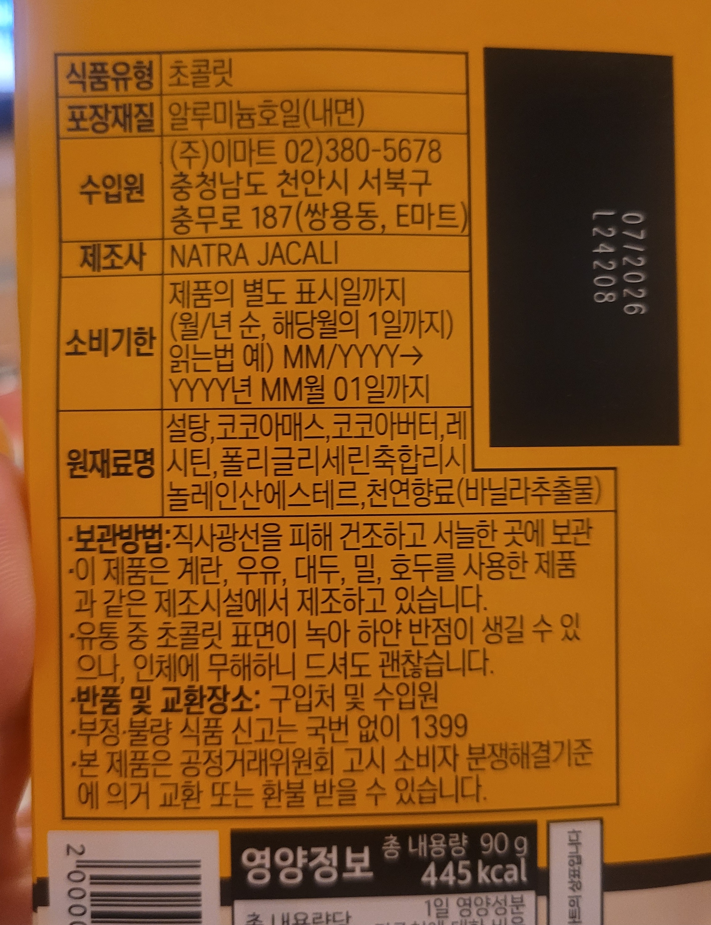 원래는 100g이었는데 90g로 줄어든 무게로 초콜릿도 얄쌍해졌다는 평이 많다