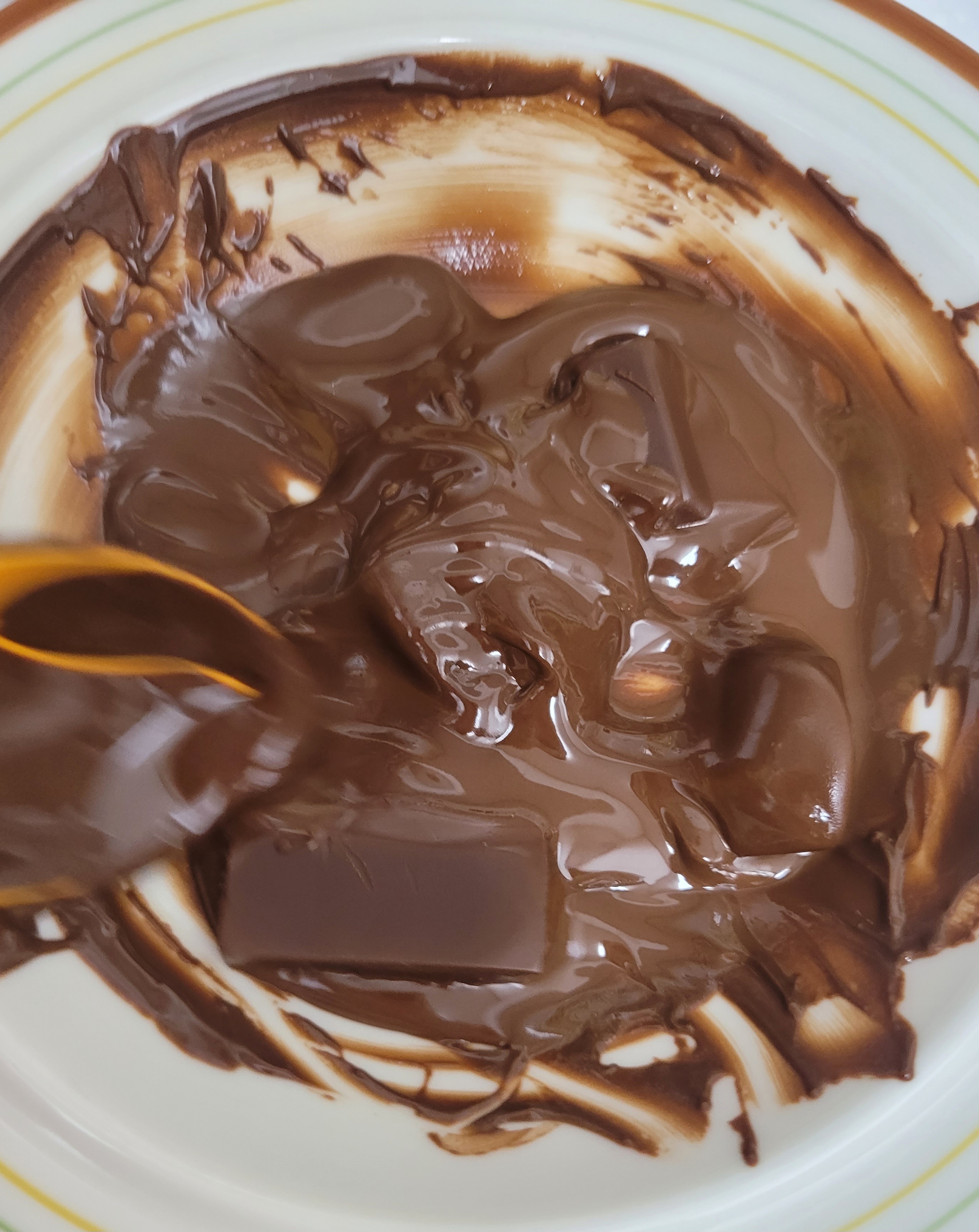 열이 보존되는 두꺼운 그릇을 쓰는게 좋다 1분정도 돌리다가 숟가락으로 눌러보고 얼마나 녹았는지 확인 후 10초~20초 녹여주고 그릇에 남은 열기로 초콜릿을 녹여준다