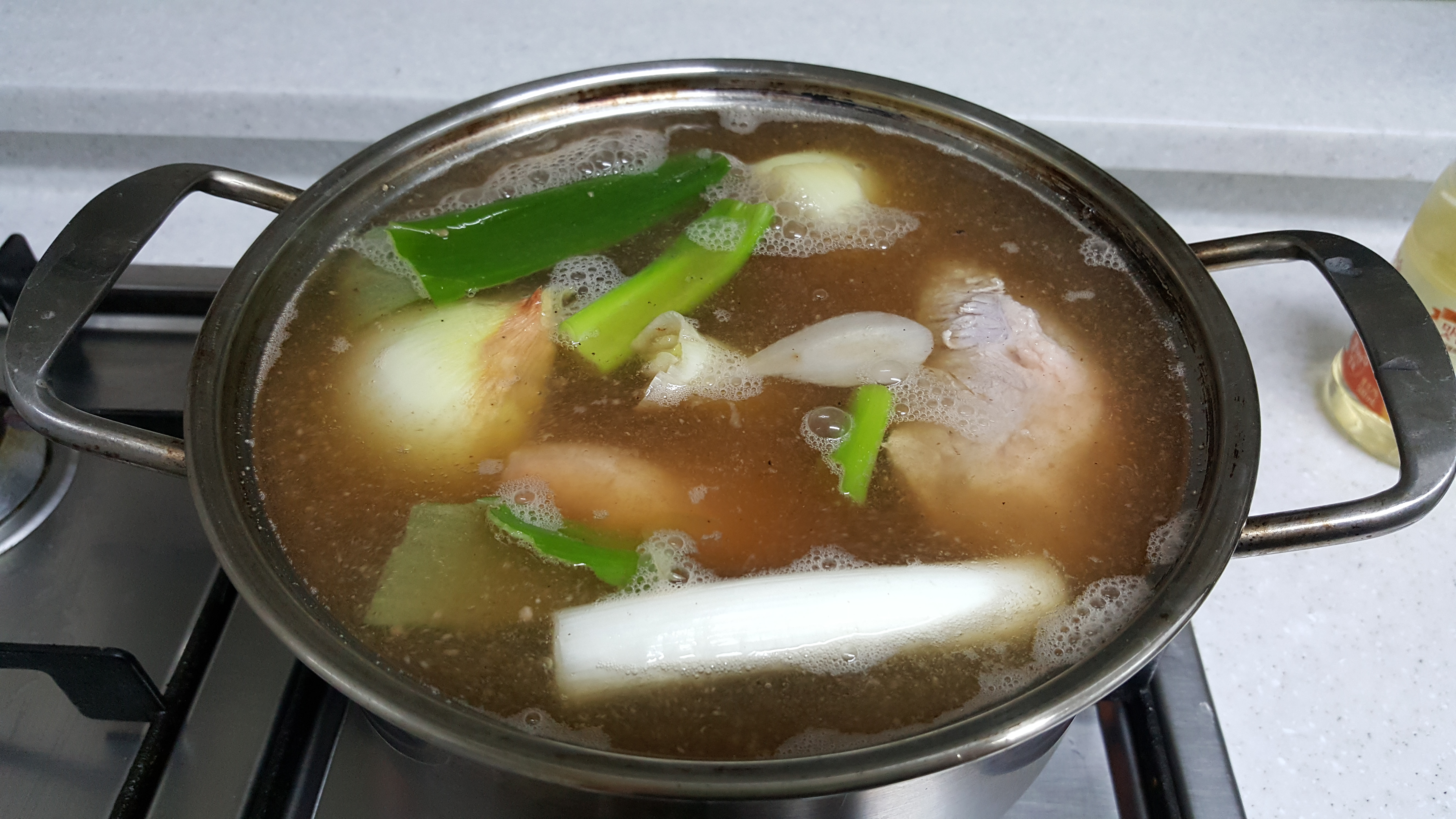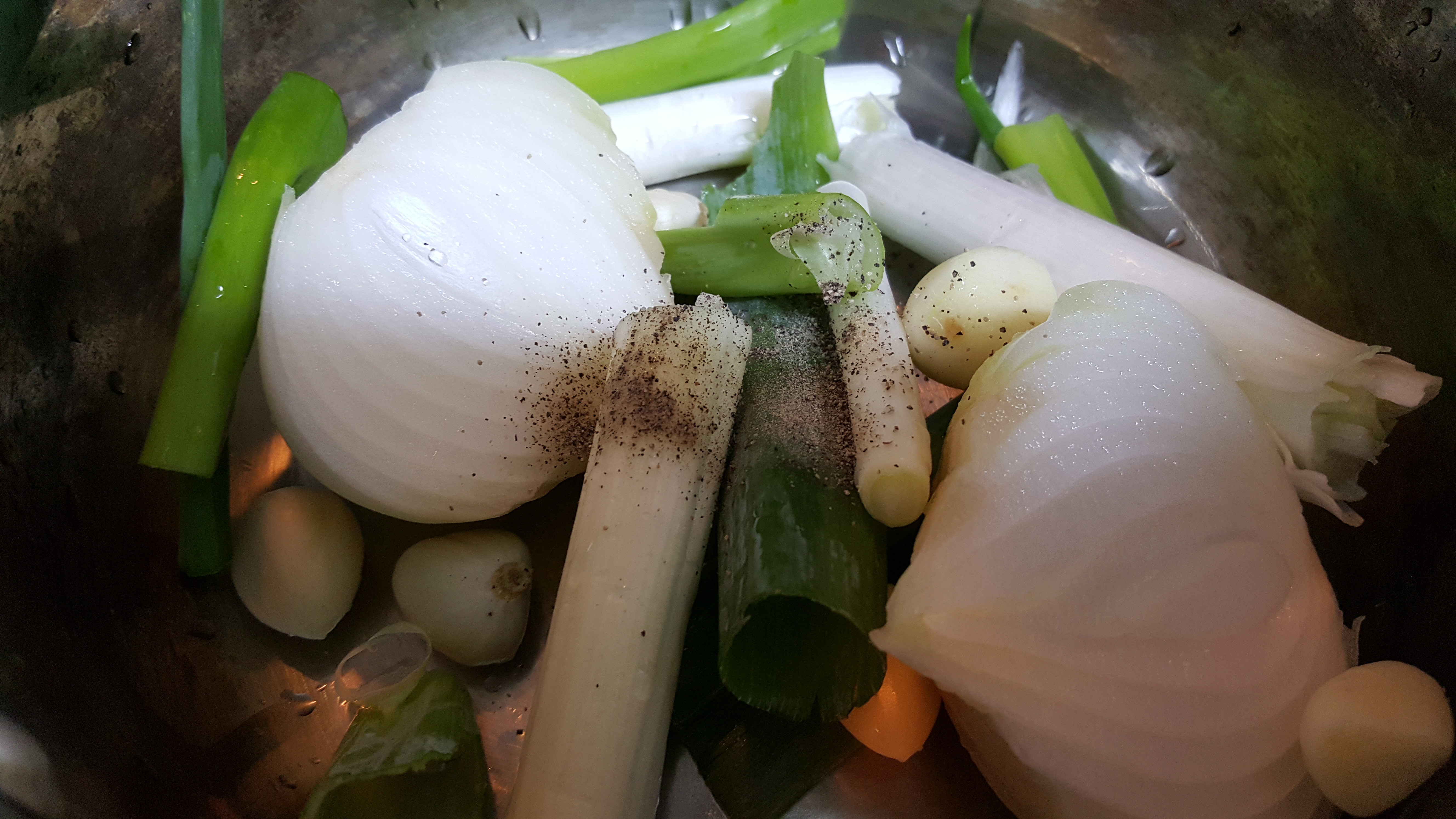 아주 현실적인 쿠킹시작. 양파와 마늘, 파는 씻어서 다듬어 냄비에 넣어주면 된다. 파는 씻어서 뜯어 넣었다. 채수를 먼저 내서 고기를 넣으면 더 맛있다고 한다. 그래서 채수를 먼저 준비하기로 함.