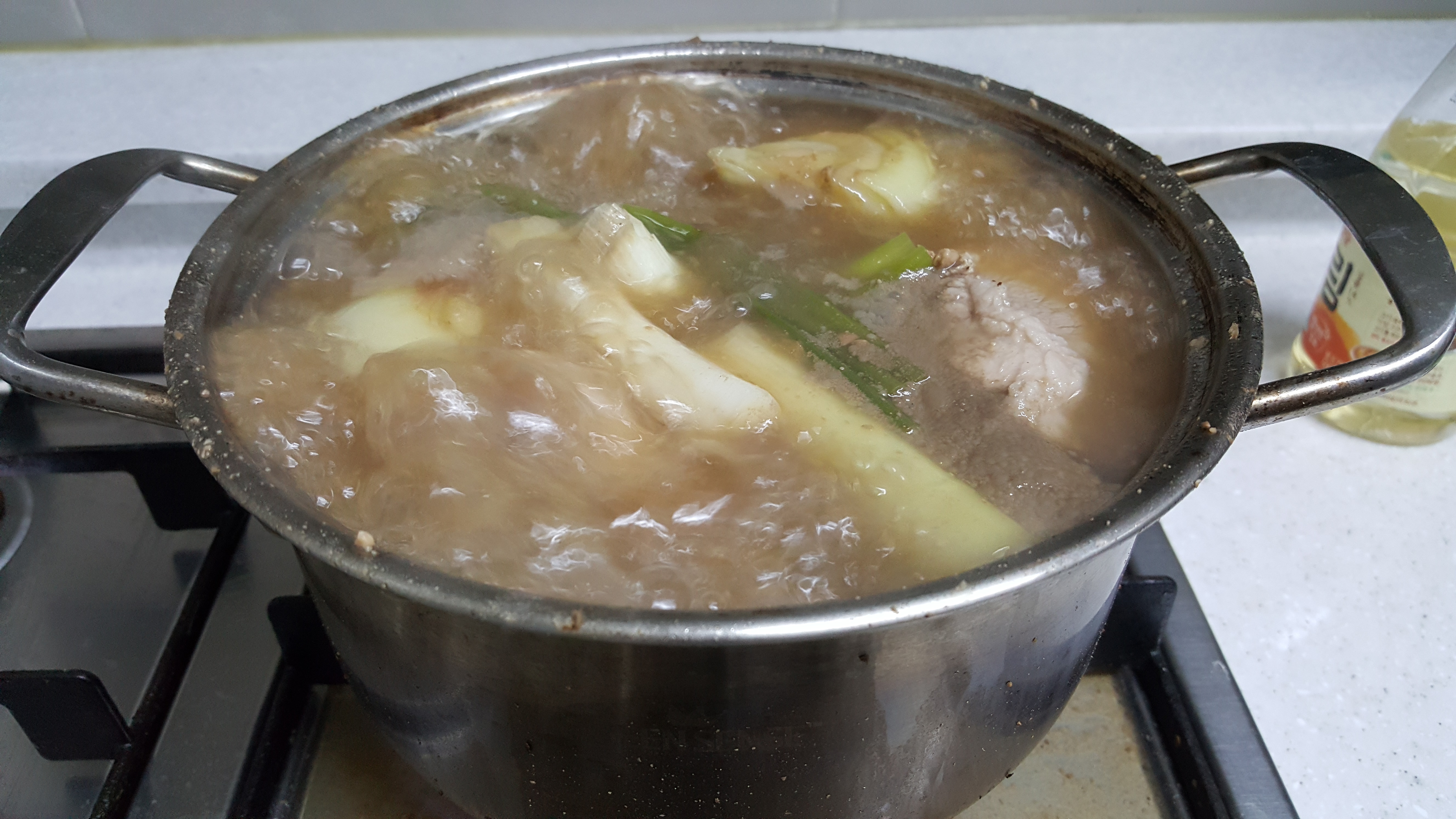 물이 팔팔 끓어 고기를 다 넣었더니 냄배가 넘칠 것 같다. 끓다보면 가스렌지가 엉망이 될 듯..