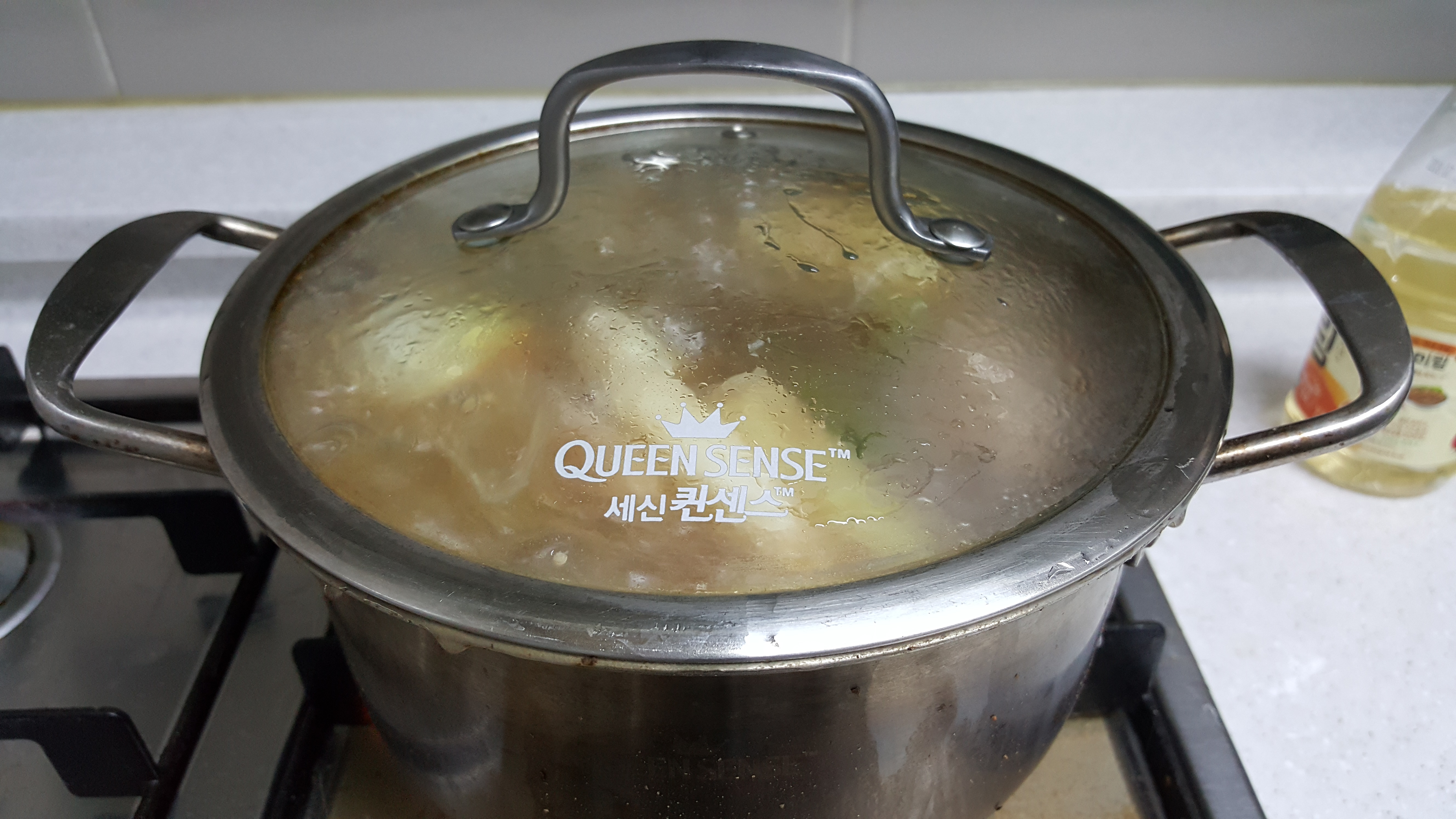 냄비는 꼭 큰걸로 쓰세여 그렇게 중불로 30분간 끓여주고 젓가락으로 고기를 푹 찔러 피가 나오지 않으면 완성이다.