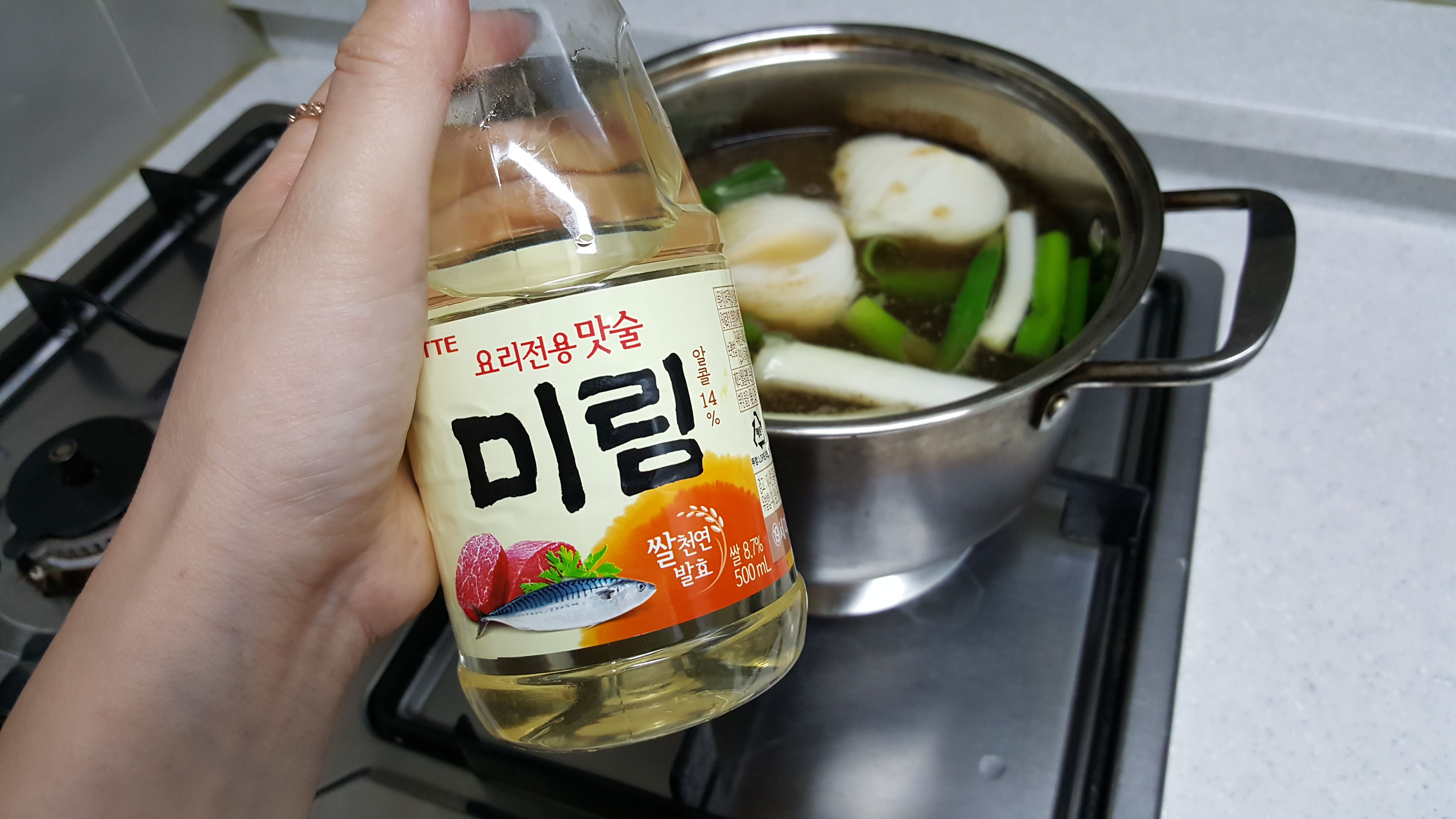 다음 미림. 맛술을 넣어 잡내를 2번 제거한다. 2~3큰술을 넣어주면 된다. 물이 팔팔 끓어오를때까지 기다린다.