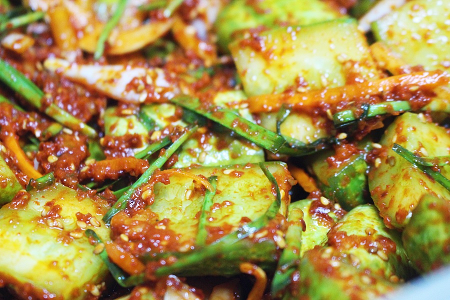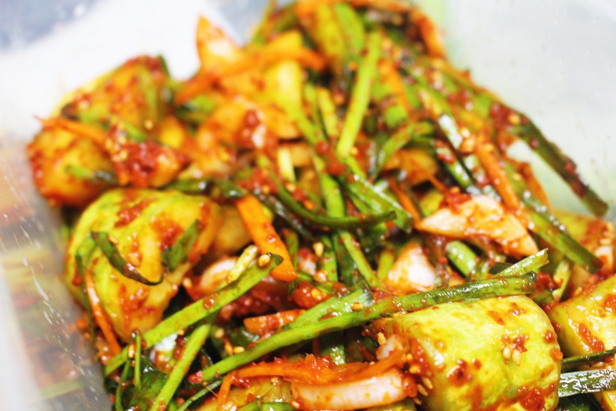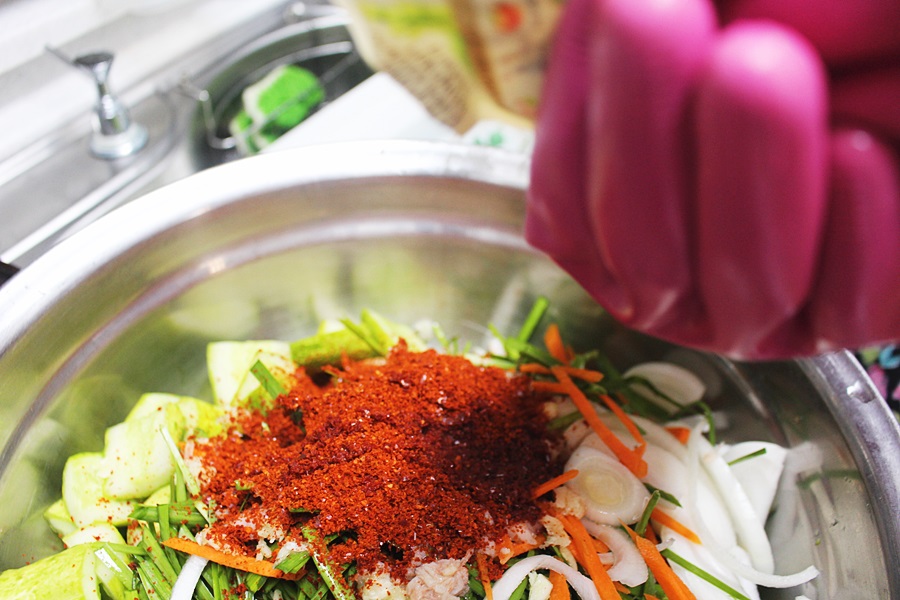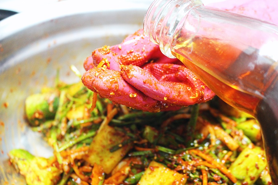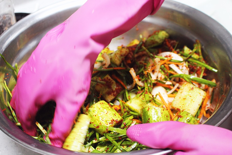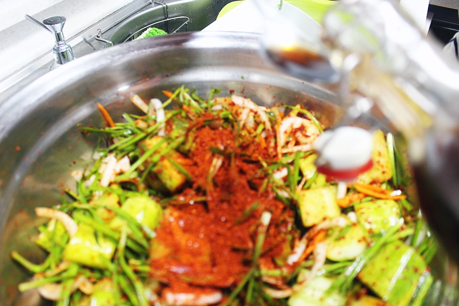 절여진 오이를 물이 한 번 씻어 본격적으로 만든다.
