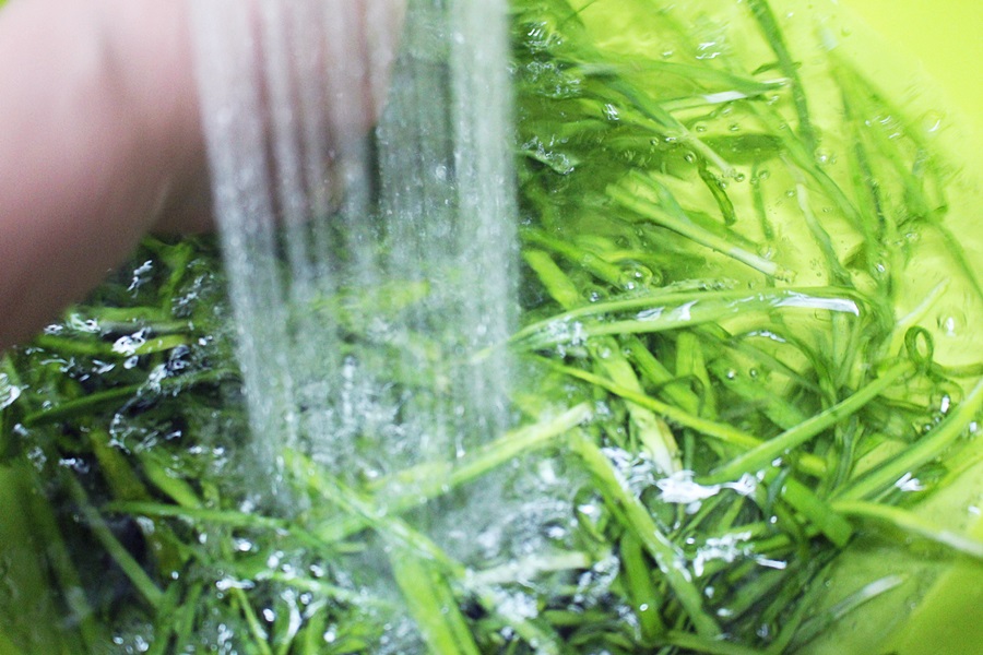 부추씻기. 가장 귀찮다. 냉장고에 며칠 묵었다 쓰는거라 상태가 많이 좋지 않았다. 가위로 상한 부분은 잘라내고 찬물 샤워를 몇 번 시켜줌.