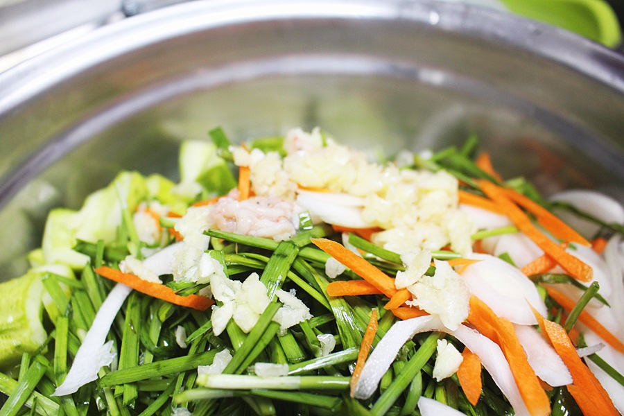 씻은 부추와 양파, 당근, 마늘을 준비한다. 당근과 양파는 채썰어 준비해주고 부추는 3~4cm가량으로 잘라주고 마늘은 다져준다.