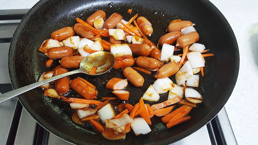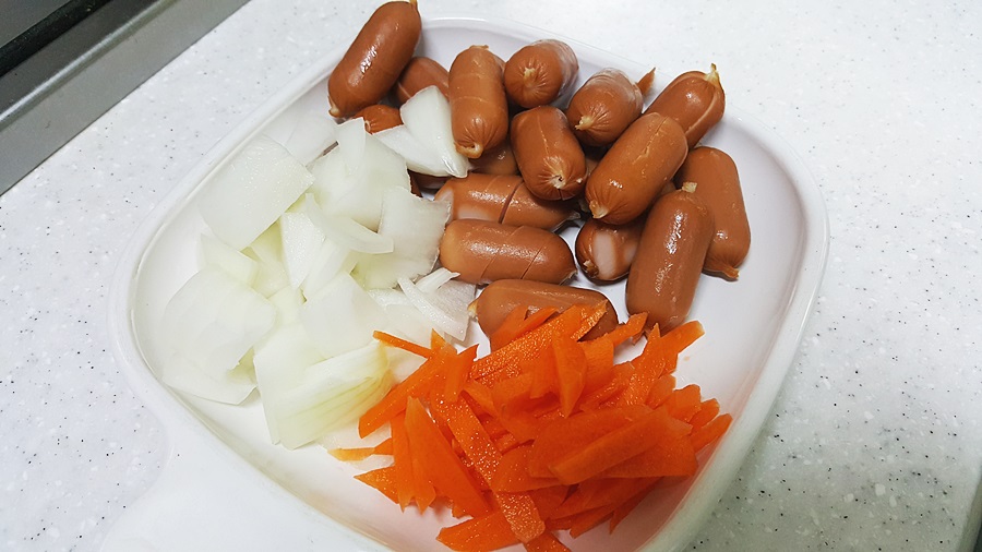 재료는 간단하다. 양파, 당근, 소세지로만 준비했는데 집에 파프리카, 양배추가 있다면 넣어도 좋음. 매운걸 좋아하면 매운고추도 첨가하면 더 맛있다.