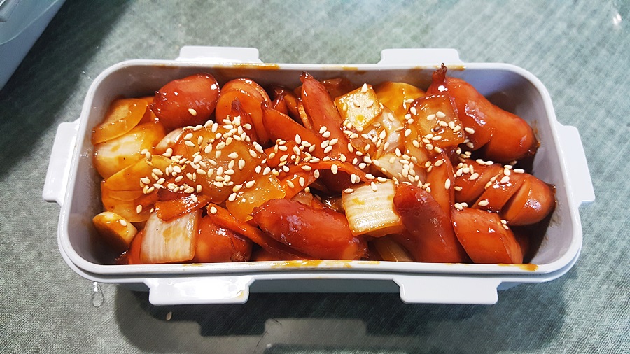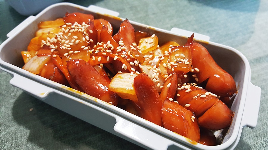 쫜 도시락 통에 담아 깨소금을 살살 뿌려주면 사랑의 도시락 반찬 쏘야볶음 완성이다.